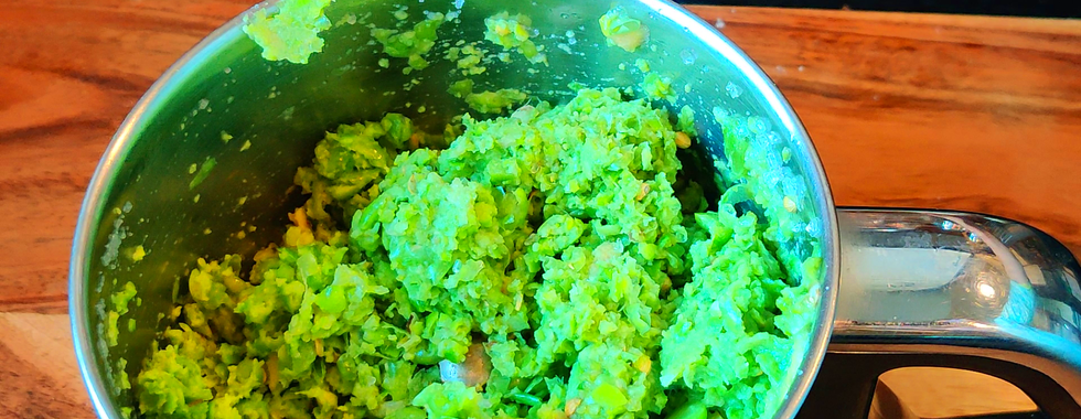 Divide this parboiled pea s into two portions of 1C each. Place 1 cup of these peas portion in a mixer jar. Add an inch of diced ginger, sugar, salt, Green chill’s (2-6) (As per the spice level you can enjoy), and some Coriander seeds. Now grind into a coarse mixture.