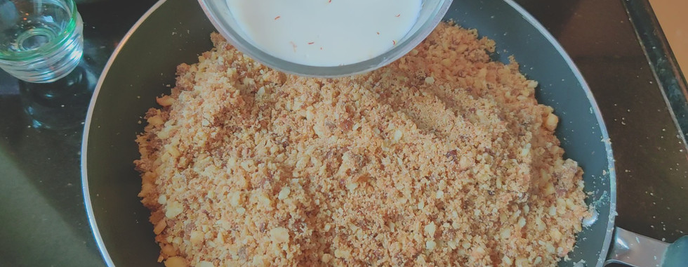 Now slowly add saffron infused milk little by little into the mixture so So that the rawa moistens up an it can come together. Keep it aside for 2-3 hours or best practice is to keep it overnight . This will mature the Masala and they will start giving out their aromas
