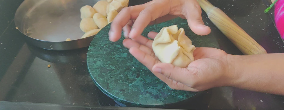 Now roll the dough balls into small disks or chapattis and place the flattened ball of filling on top of it. Cover on all sides and twist of the excess from the top and seal the ball