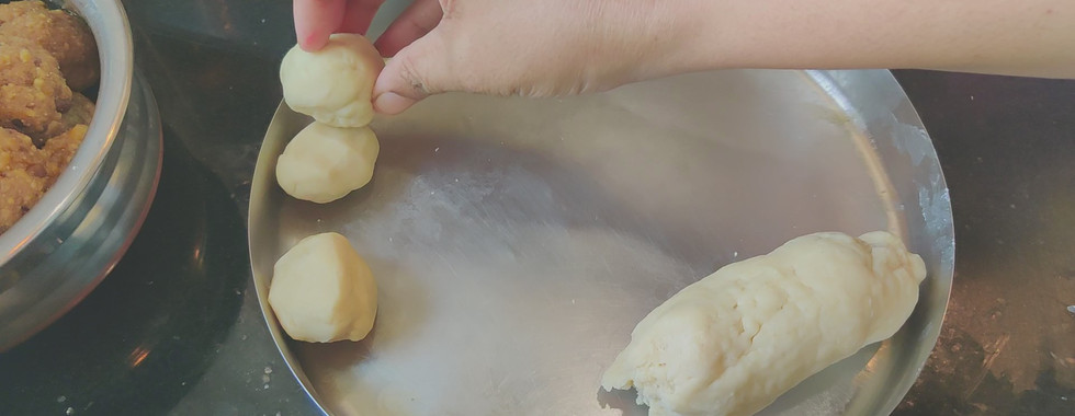 Portion of the dough to form same size and number of balls as that of the filling .