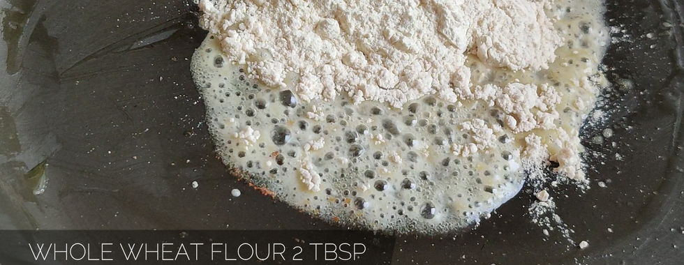 In the same pan add 1 tsp of ghee or butter and add 2 tbsp of whole wheat flour sauté the mix for 2-3 min. Now add 2 cups of milk and mix with a whisk so that all the lumps are removed.